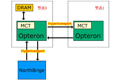 在Opteron系统中,与Xeon系统共享式内存结构所不同的一个特点是,各块Opteron处理器可以拥有自己的本地内存,他们共同组成一个节点(node)。各个节点内的处理器通过内置的内存控制器与节点内的内存交换数据。这样,在多处理器的情况下,系统的内存峰值带宽=节点数目×节点内部内存峰值带宽。如下图:
