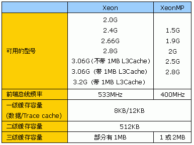 与Opteron系列不同的是,在Intel Xeon(MP)阵营里,各款处理器缓存的容量存在一定的差异,这是需要大家特别注意的一个区别。在Xeon系列中,3.06G以下频率的就只带512KB二级缓存,同时3.06G的Xeon也被分为带1MB三级缓存的版本和不带1MB三级缓存的版本。当然,在64位平台上,还有安腾系列,但安腾平台并非本文的重点。目前为止,根据Intel官方所公布的最新数据,Xeon(MP)各款处理器的具体参数如下: