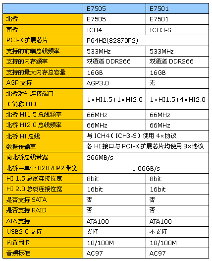 图中可见,为了满足服务器、工作站市场的需求,除了通过Hub interface1.5接口连接传统的南桥之外,E7505、E7501、E7500均可通过数个Hub interface2.0接口连接82870P2 PCI?X功能扩展芯片实现对PCI-X的支持。它们的具体特性如下: