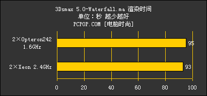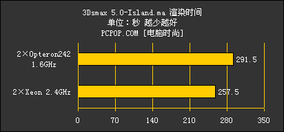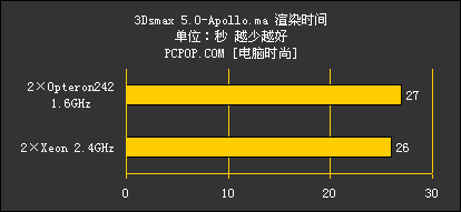 在3Dsmax5.0的CPU最终渲染测试中,双处理器发挥了应有的威力,不过Opteron242的表现并没有我们想象中的那么好,反而落在了Xeon的后面,而且差距随着渲染复杂程度的增加而增大。想来是由于执行3Dmax5.0的SSE指令处理矢量数据时效果不佳,加上运行频率又比较低使然。