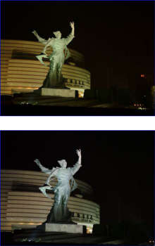 上图的雕像(上边为S602拍摄,下边为S7000)是在晚上利用从下面射上来的灯光作为主光源拍摄的,光源为日光灯。从这幅图可以较为明显地看到S7000的成像质量以及两者在成像方面的差别。