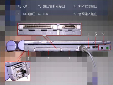在机身的左侧面,可以看到1394与USB在当时来说比较超前的端口以外,为了兼容其它在机身没有设计的接口还设有的端口复制器I/O扩展接口,和特殊的外置软驱接口。采用V.90协议的MODEM电话线RJ45接口则是非常巧妙的开盖斜口,这种设计在505系列中应该是首次使用了,在以后的VAIO505不同版本中以及其它系列的超小超薄机型中都有运用。比如Z505、C1系列等。端口复制器接口和软驱接口采用塑料材质的盖板,套在伸入到机体内部起固定作用的软塑胶条上面,打开与盖起很方便。在接口的安排上,电源的接口、1394、USB显然有些处得太拥挤,不过,还好1394一般都为连接线而没有直接连设备的,所以,不会与周边外设产生任何的抵触。而RJ11接口的设计真的是很棒,后来也一直延用了这种巧妙与机身的组合方式。