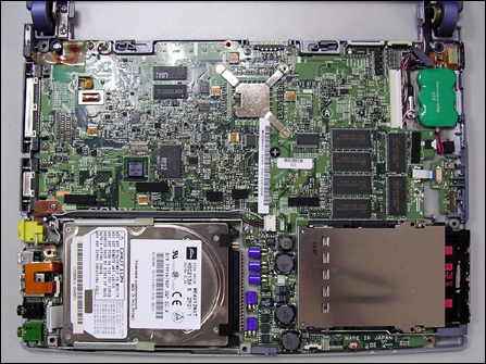 从图中我们不难发现一点,就是所有的组件全部都整合到了主板上面,包括电源板(PCMCIA与硬盘之间的那块电路部分),这为其505TR的机身做得更薄打下了基础。相信你可以通过看其放大的图片,认出在正面的每一个部件。芯片组与显示芯片之内的主要芯片没有设计在正面,而是全部在主板的下面。这样做当然是有理由的,而且完全符合实际使用。我们知道这些主要的芯片其发热量相对比其它的芯片要大很多,因为505TR没有风冷系统,所以,通过直接的导热是其主要方式,那只有通过镁合金的底外壳是最好的选择。如果选择正面,不但散热效率不高,而且通过键盘来散热是根本不能达到最好的效率,另一点也给有用户的使用带来不便,谁愿意整天在一个热量很高的键盘上面来进行一些电脑的操作?我们先来把正面部分包括主板上的一些组件逐一认识。然后我们再来掀开主板底面。