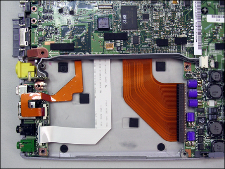USB、1394、音频输入输出由两条数据线从主板的下面接口引出来,插接在端口的电路板上面。而电源则是由四条铜质电线从左边连接到主板的中央位置,由位于硬盘与PCMCIA之间的电源板部分负责供电系统。同时我们可以看到,在硬盘的下面,其实垫着三条不同宽度的数据线,特别是硬盘数据线,这也无形减少了硬盘与底外壳的直接接触面积,对于硬盘的散热来说又是不利的,好在位于硬盘正上方的腕托也为镁合金的外壳,进一步为其散热提供保证。