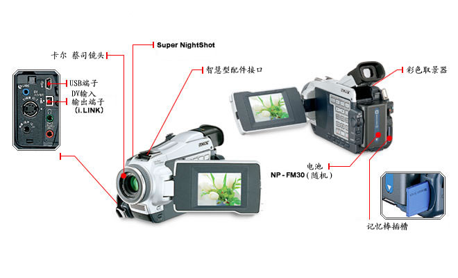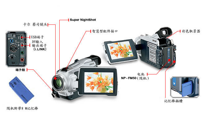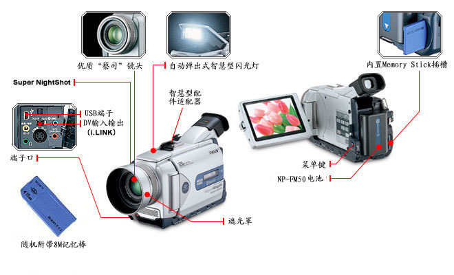 这部摄录机配备的专业蔡司镜头同样具有10倍光学变焦能力和20倍/120倍可选数码变焦,还配备有分辨率为246400像素的3.5英寸彩色液晶显示屏及18万像素的彩色取景器 ,内置弹出式智能闪光灯支持自动、防红眼自动预闪、开启和关闭几种闪光模式,传输端口包括视频输出/输入、S端子、i.Link接口、USB接口及红外端口,随机附赠的NP-FM50锂电池可支持长达150分钟的使用时间。其它方面的功能基本上是这一系列机型都具备的,其中包括超级电子防抖系统、12/16位PCM数码立体声录音系统、模拟信号视频/音频输入输出、超级红外线夜摄、程序自动曝光、画面特效、数码特效、回放放大等。 6、索尼DCR-TRV40E数码摄录机