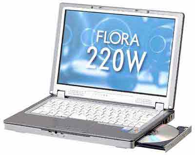 FLORA 220W按照CPU的不同可分为两款,其中搭配Pentium M1.5GHz的机型将于2004年1月9日发布,售价为232000日元(约合人民币15479元);搭配超低电压版Celeron 800A的机型则将于2004年1月16日发售,价格为212000日元(约合人民币14100元)。除去CPU以外,FLORA 220W其他配件通用,采用855GME芯片组,256MB内存(PC2700 最大768MB),30G硬盘,内置24速CD-ROM,可选配DVD/CD-ROM光驱以及IEEE802.11b/g无线网卡。FLORA 220W的机身体积为296.8×215×29.3mm,重约1.83kg。机身上带有Type2 PC卡×1、Type2 CF端口×1、USB2.0×3、IEEE1394×1、有SPDIF输出。操作系统采用Windows XP Professional,也可改为Windows 2000。标准电池的使用时间为约2.6小时和约2.7小时。