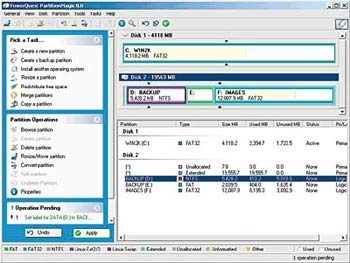 工具软件PartitionMagic 8.0售价69.95美元,是PowerQuest公司制作的产品。使用今天超大规格的硬盘,如果没有PartitionMagic 8.0,很难想象会生存下去。使用这个应用软件,你可以在不丢失数据的情况下很容易地创建、拷贝、重新划分硬盘大小和修改硬盘分区。这个软件还提供了几个独家的工具。这个软件可以修改系统的注册和开始菜单,这样系统就可以很容易地找到移动到新的硬盘盘符下面的程序。