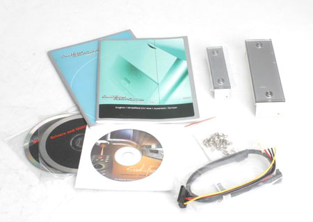 便携式的带提手包装,马上可以感觉出iDEQ 200N的体积和重量都是比较小,对如寒、暑假需要带电脑回家的学生来说自然是再好不过了。附件相当齐全,包括了产品说明书、驱动光盘、SATA数据/电源线,还有5.25寸和3寸前面挡板各一块。