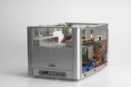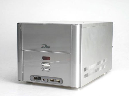 紧接着就是我们的主角出场--DEQ 200N。iDEQ 200N如同一个金属的长方体的小盒子,整个规格为210mm x 323mm x 187mm (宽x长x高),比较的小巧。前面板可以滑动,在光驱不用时可以盖主,使整个面板浑然一体。iDEQ 200N的材料是铝金属,有利于整个准系统的散热、质量也比较轻,但是也使架构偏软。