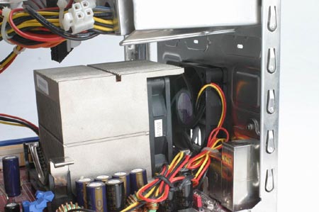 上面提到了可以采用Pentium 4的散热器,这次200N就是采用了Pentium 4的热管散热器,通过散热器上的热管可以更好的把热量带到风扇作用的地方,迅速抽走热量。CPU风扇又正着200N背部的一个机箱风扇,第一时间将热空气抽出准系统,顶上的电源同样可以发挥吸出热风的作用。