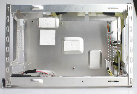 映泰iDEQ 200N在结构设计上有不少出色的设计亮点在细微中体现,比如,在散热上充分利用了整个铝质的准系统机箱。利用特殊的导热橡胶在主板上几个发热两较大的位置垫起,通过橡胶与机箱很好的接触,把散热发挥到每个角落里;iDEQ 200N简单的一个卡扣,就能把大捆的电源线安置好,合理腾出空间,有助于散热;硬盘架采用滑轨的方式大大方便了安装(只是滑动时摩擦比较大)。