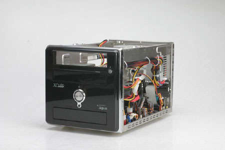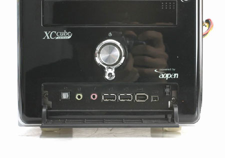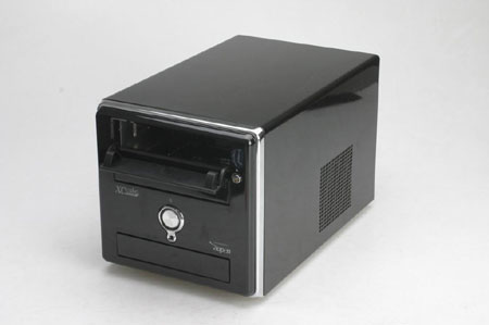 今天我们测试的XC cube EZ65是爵士黑,机箱外层进行了特殊烤漆处理,相当光滑。整个XC cube EZ65(以下简称:EZ65)设计采用了比较常见的小长方体造型,但是从按键的风格和布置,不仅让人将它和苹果机的简约风格联系起来。可以看到侧面有大面积的散热孔,但是担心这样容易使灰尘进入。