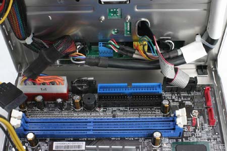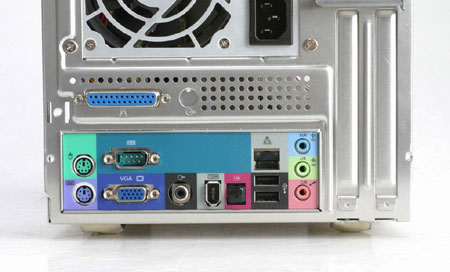 前面板接口依次是光纤输出口、麦克风/耳机音频孔,两个USB接口以及两个火线接口(其中还有小口的火线接口,这是特别照顾数码摄影机的)。背面的接口同样非常丰富,依次是键鼠PS/2接口,并行/串行接口,VGA接口,AV音频接口,火线接口,光纤接口,网卡RJ45借口,USB接口和声卡接口;我们看到了在其它准系统所难见的并行、串行接口,虽然这两个接口并不常用,但是对一些工业上的应用和一些类似加密狗的应用上,并行、串行口仍然有着它的作用存在。