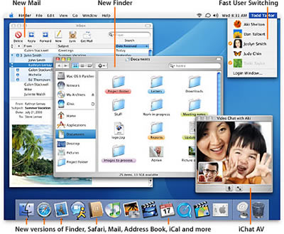 Mac OS X 有非常优秀的图形界面,并提供了很多和Windows 相似的功能。比如Finder 的搜索,可以迅速地找到硬盘、iDisk 或者网络服务器、移动硬盘的数据,传闻Windows Longhorn 也集成了优秀的搜索功能,应该和这相差不远吧。Mac OS X 使用了先进的虚拟内存和内存保护技术,允许你同时打开多个应用程序,并且程序间发生冲突也不需要担心丢失数据,我就知道有人用Photoshop 同时打开了300张图片都没有问题。此外,Mac OS 还集成了很多有趣的软件,比如PDF 阅读器"Preview",视频聊天软件"iChat AV",网页浏览器"Safari"(听说是最快的Web浏览器"。