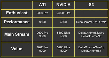 据称,基于新核芯的图形显卡有三款,高端的DeltaChrome F1,板载256MB显存,兼容DirectX 9.0,可支持HDTV输出,集成Chromotion可编程视频引擎;主流的DeltaChrome S8,除只是支持128MB内存外,其它特征基本与前者一样,预计核芯/显存的频率亦会有所降低;此外,就是廉价市场的DeltaChrome S4,其基本特征与前者S8一样,工作频率有所不同而已。