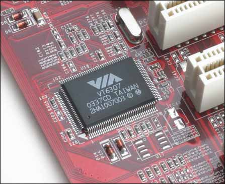集成IEEE1394接口和Mini 1394接口的主板上,当然少不了VIA的VT6307控制芯片,msipt880提供了一组标准和一组小型的1394接口,分别用于移动存储设备和视频采集设备之用,省却用户另外购买转换接口的麻烦。