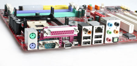 微星对速度较慢的com接口只保留了一个,取而代之的是针对主板多媒体功能的两组大小不一的IEEE1394接口,方便用户使用不同的高速火线传输设备,在两组USB接口上方还配置了同轴信号输出接口,在背部接线板上预留了光纤输出,方便外接解码器和数码录音。alc655提供的6.1声道处理功能虽然和独立声卡仍然有一定差距,但一般用户欣赏音乐、播放dvd大片或游戏等使用是绝对没有问题的。
