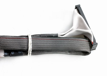微星的硬盘排线从865主板开始就采用了这种折叠式的处理方法,并在外面包上尼龙线以固定线材的形状,虽然其材料都是传统的排线,但经过这个折叠和紧固的处理方法将使排线表面积缩小,有利于机箱内部的散热,在透明的机箱中更能凸现个性。不过,折叠的排线在信号的窜扰方面的问题不容忽视,如果将尼龙网换成有效接地的金属网则会对数据的安全传输有一定的帮助。