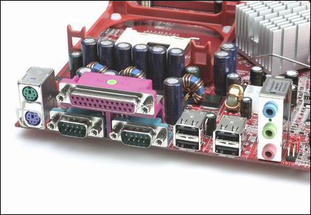 整块主板采用红色PCB板,标准的ATX结构布局合理,电子元件排列整齐。接口相对比较保守,提供四个USB 2.0接口,从接口上可以发现这款主板没有集成网卡芯片,在目前集成网卡普及的年代,算是有点遗憾。