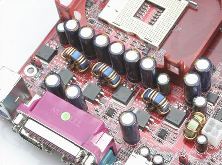 采用三相供电,电容排列整齐。四条DIMM插槽支持双通道DDR400,红白分隔的做法有利使用者正确是使用双通道。
