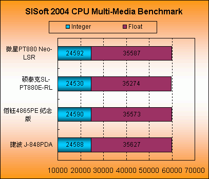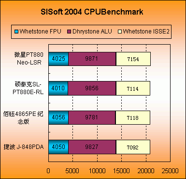 我们又使用了SISoft 2004进行各项测试,除了848P在内存性能上差别比较大,其他的都比较贴近。