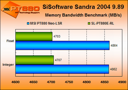 很明显,在两者均打开并将V-link设置为Mode 4的时候,得分最高,Mode 1次之。不妨比较V-Link和Top Performance对系统性能提升的重要性:单独打开V-Link而将Top Performance关闭时,分数为4704,关闭Top Performance致使内存子系统下降161/154分;而将V-Link关闭,Top Performance打开时,关闭V-Link使得内存系统性能下降35/36分。可见Top Performance在这个系统中占据着性能提升的主导地位。看来,VIA PT880芯片组的主板上,仍然有类似于865PE打开PAT功能后,通过将内存延时大幅减少而提升整体性能的功能。