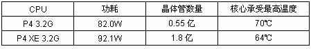 可以看到,由于加入了2M的缓存,与频率相同的P4 3.2G相比,P4 XE 3.2G晶体管数目暴增,功耗也增大了10.1W。可见缓存的增加对现有的主板的供电系统是不小的考验。缓存的增加也对CPU的散热提出了更高的要求。核心最高温度下降到了64℃,散热器的热阻至少要求达到0.25℃/W,超频也更加困难。