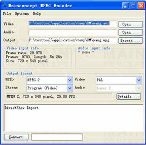 这是一个功能强大的MPEG编码软件,可以帮助你快速的将AVI文件压缩并重新编码为高品质的MPEG视频文件,压缩速度很快,支持批处理操作,支持将多个MPEG文件合并为一个MPEG文件,程序界面友好,操作非常简单。我们测试是一个5分26秒(31.7MB)的AVI文件,参数设置为“720×540,25FPS,PAL”。