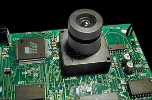 如图,你可以看到这些相机的内部结构。CMOS成像器被直接焊接到电路板上。镜头和成像器被作为一个整体的单元来进行工作,芯片在底板上,镜头也用螺丝固定在上面一定高度的地方。 它的镜头本身很小,而且也没有控光装置可以变换光圈,也没有自动聚焦的系统。但是它有一层可以阻挡一些影响芯片的辐射的外衣。