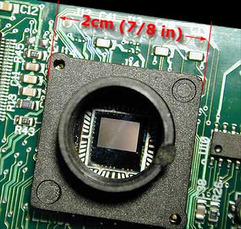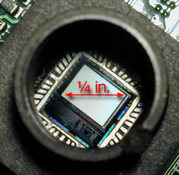 再凑近一点可以看到芯片中的感光芯片,就是上图中央的小片。这块特别的传感器包含有超过300,000个象素,按规则的行列排列。