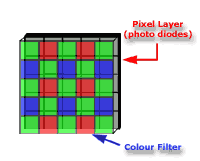 芯片上方是马赛克色彩滤色器。滤色器只允许三种颜色的光中的一种颜色照射到任何单独的像素上,要么是蓝光,要么是红光,要么是绿光。多余的绿光是用来增加对比度和清晰度的。 这些类型的相机都很便宜,因为他们容易进行大批量的生产。不象高级数码相机的光学系统那样复杂,它的光学系统十分简单:没有自动调焦,没有光学变焦和复杂的机械装置等等。