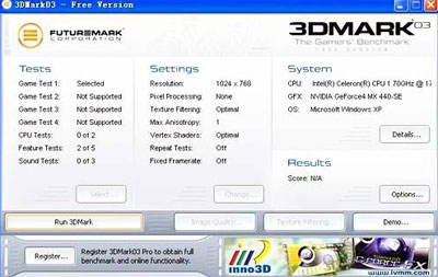 当然,其中最让人侧目的还是这张3Dmark2003测试软件光盘。InnoVISION是Madonion(3DMark系列软件的制作公司)的“初版测试商”,看看上面微软、INTEL、DELL、nVIDIA、ATI...这些响当当的名字,InnoVISION也是为数不多的得此殊荣的显卡品牌,无不体现了其强大的研发实力。而作为Madonion“初版测试商”,InnoVISION的LOGO出现在了所有3Dmark2003 Pro版的测试界面上(如上图)。在满足你绝对虚荣的同时,无疑这也是对InnoVISION显卡品质的一种肯定。