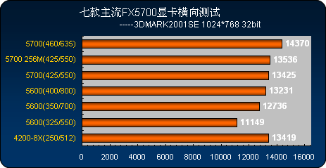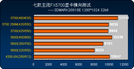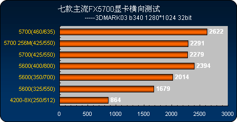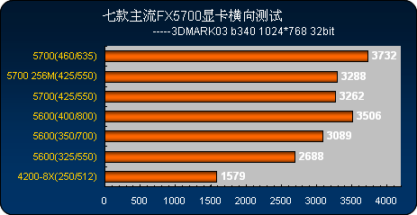 3DMARK03中,4200-8X由于不支持DX9,不能完成所有测试DEMO,成绩基本不具备对比性,仅作参考。我们看到频率仅为425/550MHz的FX5700性能已经基本等同于400/800MHz的5600Ultra,NV36核心架构的优秀可见一斑。