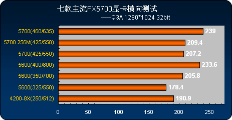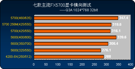 在Q3A测试中,400/800MHz的65600Ultra再次显示了带宽的威力,4200-8X则落后于5700许多。