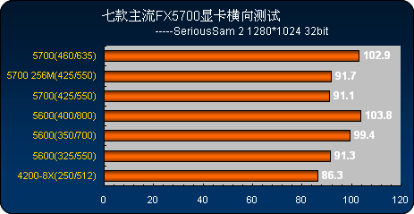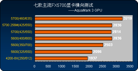 测试中我们使用了Pentium 4 3.2GHz,875P配合双通道海盗船内存,基本是目前最高的性能平台。为了对比成绩,我们还加入了四款对比数据,分别来自七彩虹风行4200CF白金版(250/512MHz)、气彩虹风行5600Ultra升级版(400/800MHz)、气彩虹5600Ultra白金版(375/700MHz)和一块标准的5600(325/550MHz)。