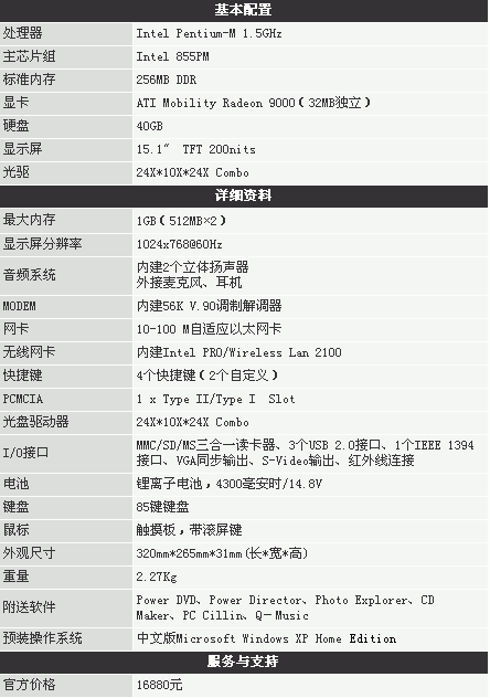 从上表可以看到,Joybook 5100的硬件配置中较为突出的,是主要采用了Pentium M 1.5GHz处理器及ATI Mobility Radeon 9000显示卡,同时200nits的15英寸液晶显示屏也是卖点之一,再配上无线网卡使其成为不折不扣的迅驰笔记本,整体硬件配置属于中等偏上水平。在附送软件方面,BenQ还是相当的阔绰,赠送了包括视频播放、杀毒防毒、多媒体制作在内的多款实用工具,与许多国内品牌相比下优势马上就体现出来了。但是Joybook 5100的最大的不足就是重量问题,在厂家公布的数字里,不含电池的情况下重量已达到2.27kg,看来它还是不太适合舟车劳顿。