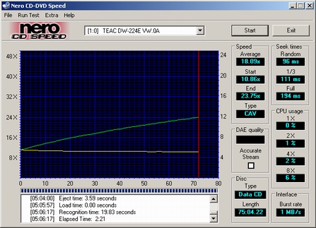 最后进行的是5100所搭载的Combo光驱的测试。Teac型号为DW-224E的Combo支持24速CD读写,4速DVD读取,测试过程中的震动和发热都控制得十分理想,可惜在读取CD碟片方面表现得不太理想,经多次更换碟片测试后才得到较为理想的测试结果,速度离标称的24速还有少许距离。虽然Combo光驱多少会存在这样的问题,但也希望只是个别现象,在读取DVD碟片方面则十分畅顺。