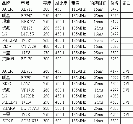 在现阶段如何选购17寸的液晶显示器呢?大家可以看看下面的表格,这个表格中列举了目前市场上主流的17寸液晶显示器的规格和价格,大家可以根据自己的需要来选择相应的产品。