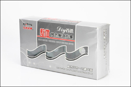 九州风神散热三合一的包装盒,以银灰色为主,盒上不但有各种散热设备的说明文字,还标有各种认证以及方位标签等。