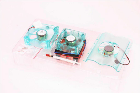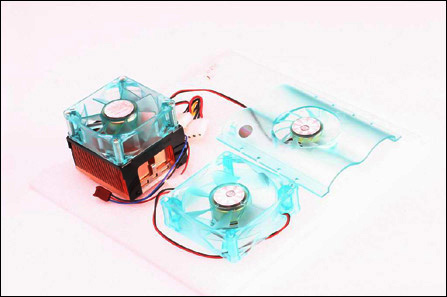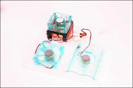这就是散热三合一的全部产品,包括CPU散热器、机箱风扇以及硬盘风扇。为了保持色彩与样式的一致性,除了CPU散热器中的散热片为纯铜以外,其他包括CPU散热器的风扇,机箱风扇与硬盘风扇均采用透明设计。