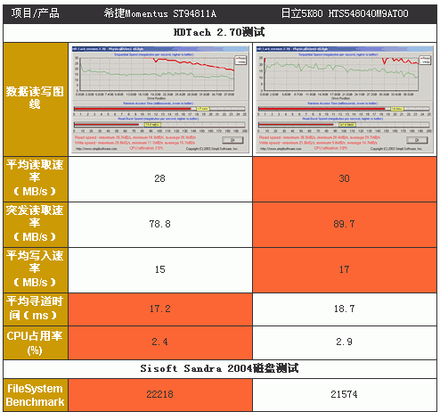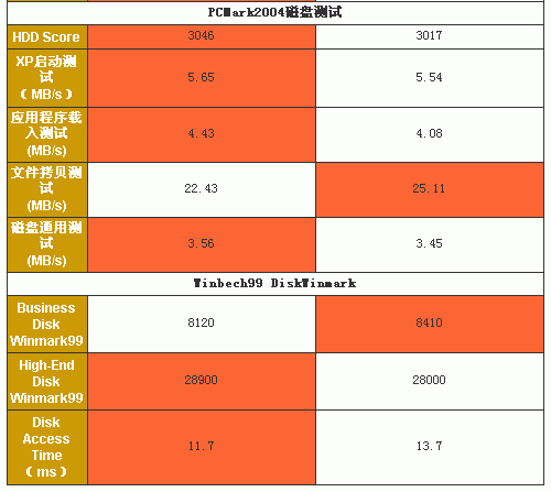 两款硬盘互有领先,Momentus取得了9项测试的胜利,而5K80只在其中5项胜出,Momentus的表现让人惊喜。细看测试结果,Momentus的优势主要在寻道时间和CPU占用率方面,接近2毫秒的寻道时间的优势使它在日常磁盘的应用即小数据快的读写方面尝到了甜头;而对手5K80则在数据传输率上占有优势,在文件拷贝等连续数据传输方面有更出色的表现。值得高兴的是,两款硬盘各方面性能都比较平均,差距也不太明显。