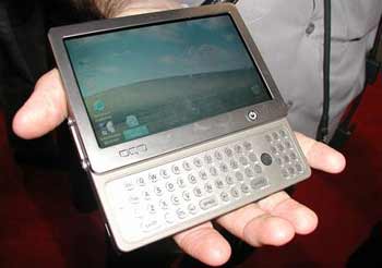 在Transmeta的这些“小玩意儿”当中,一款名为“OQO uPC”的便携式平板电脑引来的围观者最多。这款OQO uPC的体积真的非常小巧,只有手掌般大小,重量大约397g。令人惊讶的是,在其与一般VHS卡带大小相仿的机身上,竟然配备了标准键盘和5寸液晶显示器,支持800×480(Wide VGA)分辨率!这都要归功于它采用的抽拉式设计方式。另外,OQO uPC采用了1GHz Crusoe处理器,配备256MB内存和20GB硬盘,操作系统为Windows XP;具备USB接口和综合系统链接接口,通过转接器可以输出D-Sub 15,以及外挂各种流行设备。面对这样的一款产品,等闲相信目前所有的Smartphone和PDA都会深感汗颜吧。