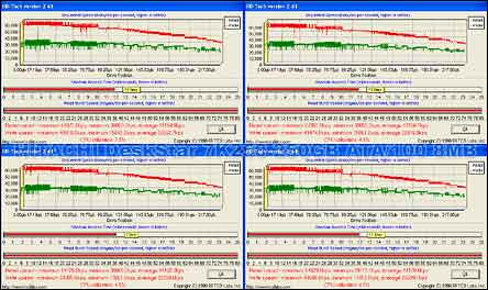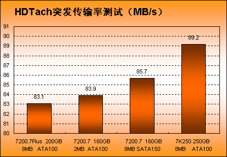 这几款硬盘的突发传输速率都没能给人太多惊喜。由于两大厂商都没有引入UDMA133,受到硬盘主控芯片和外部接口所限,它们的突发数据传输速率都在100MB/s以下。酷鱼7200.7Plus 200GB的表现远不及之前抢眼,但由于在实际使用中突发传输的几率很小,所以对实际性能的影响并不大。