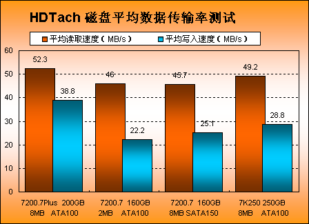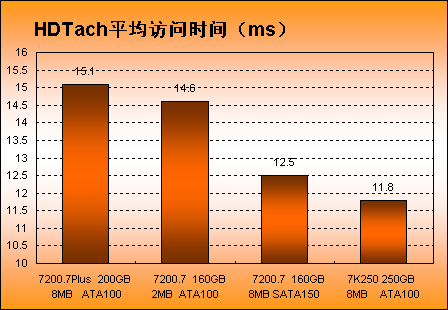 HD-Tach的读写曲线可以直观地反映硬盘的数据传输律。8MB缓存硬盘由于缓存突发传输的机会较多,所以读写曲线振荡会较大。值得留意的是,酷鱼7200.7Plus 200GB的写入曲线并不是逐渐下降的,而是中间高两侧低,我们无法解释这个特别的现象,不过可以肯定和这款硬盘新的碟片和磁头有关。为了比较方便,我们选了几个重要参数做成了柱状图。