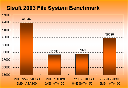 对于偏重数据传输率的Sisoft2003磁盘测试,酷鱼7200.7Plus 200GB同样有十分出色的表现,比起自己的前辈产品,提升超过10%。