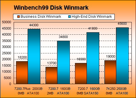 Winbench99 Disk Winmark是一个较全面的综合测试。在这里,酷鱼7200.7Plus 200GB与7K250展开了激烈的竞争。受到寻道性能的拖累,酷鱼7200.7Plus 200GB终于尝到了败绩。尽管如此,酷鱼7200.7Plus 200GB还是较老产品提高了10%左右,性能上紧逼强悍的7K250。