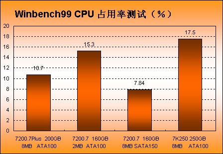在CPU占用率测试当中,除了采用串行接口的酷鱼160GB有突出的表现之外,酷鱼7200.7Plus 200GB的表现同样出色。