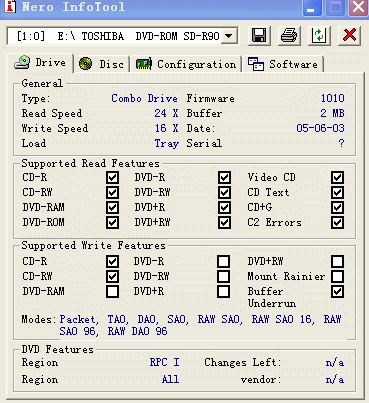 经过Nero InfoTool的检测,我们看到了这款笔记本所代内置光驱的全部参数。这是一款支持CD-R写入以及DVD播放的笔记本专用超薄型COMBO。支持16x的CD-R写入速度,24x CD-ROM读取,并对各种DVD盘片进行读取支持。