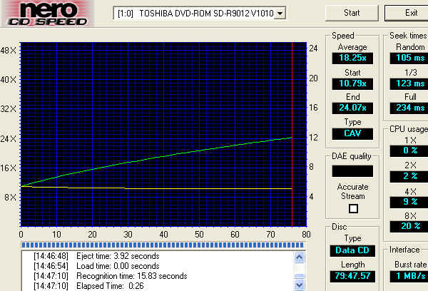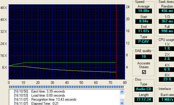 CD音轨的读取被限定在了11X(奇怪?!),寻道时间较慢,CPU占用率还算可以接受。