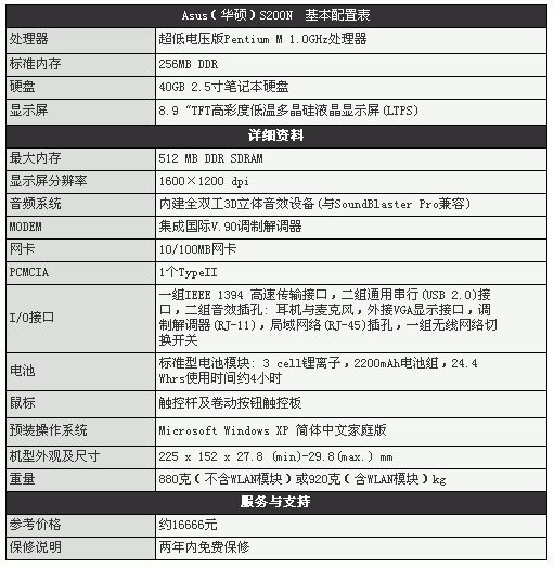 S200是十分着重商用方面的用途。CPU使用了Intel的超低电压版PentiumM 1GHz,主板芯片组是整合图形芯片的Intel 855GM,256MB内存为标准配置(最高可扩充到512MB),并预装有WIN XP操作系统。对于普通商务应用的用户来说,其20GB/40GB的容量也已足够应用(最大还可扩充到60GB)。就其重点升级的无线网络功能来看,S200N内建了IEEE 802.11b无线网络模块/天线,并凭借华硕独家的无线网络开关设计,方便的实现了有线/无线局域网之间的自动切换,用户可以随时切换无线网络的功能,确保无线网络数据传输安全有保障。体现S200N专为移动办公设计,提供便利、稳定、快速的无线网络功能。因此,S200N完全可以顺利的从企业、家庭及位于机场、旅馆等部署了无线热点的各种场所接入网络。同时,华硕S200N在全面、便利的端口和功能设计上优势也很突出。对超小笔记本电脑的用户而言,应用不仅仅限于对重量的追求,在S200N借助迅驰平台消除了无线应用最后的实现阻碍后,更满足了更大范围的移动应用和扩展需求。它几乎具备了全内置笔记本电脑应用的所有扩展端口。在机身右侧,从前之后依次是:耳机插孔、麦克风插孔、USB 2.0 连接接口(两个)、外接显示器插孔、网络线插孔 (RJ-45)、电话线插孔 (RJ-11)和电源插孔;左侧从前往后为:防盗锁槽、IEEE 1394 连接接口、无线网络切换键、系统重置键、PC 卡插槽和散热通风孔。特别值得一提的是随插即用的两个USB 2.0连接接口(传输速率高达480Mbps)和一个IEEE1394端口,支持高速的数据传输、高度实时和高自由度连接的特性。由此S200N会非常适合连接高速外设和信息家电设备,更为音频/视频(A/V)制作、外部存储设备以及便携设备提供了理想的数据传输模式。也使新闻工作者、摄影爱好者等对图像处理有着移动需求的用户感到了很大的方便,让他们有了随时随地展现才华的空间。